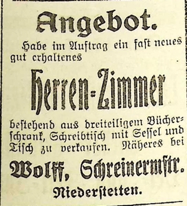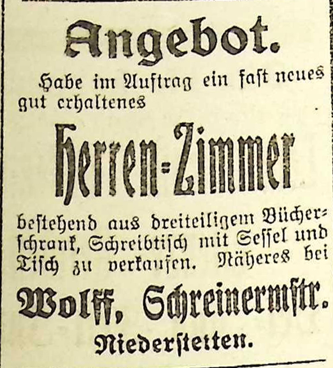 5. April 1924. Anzeige Schreinermeister Wolff verkauft Herren-Zimmer