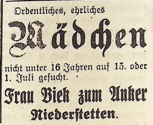 3. Juni 1924. Anzeige Frau Biek zum Anker sucht "Mädchen"