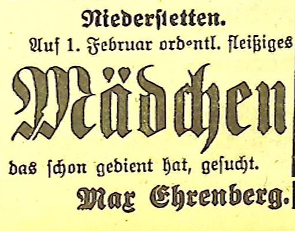 9. Dezember 1924. Max Ehrenberg sucht "Mädchen"