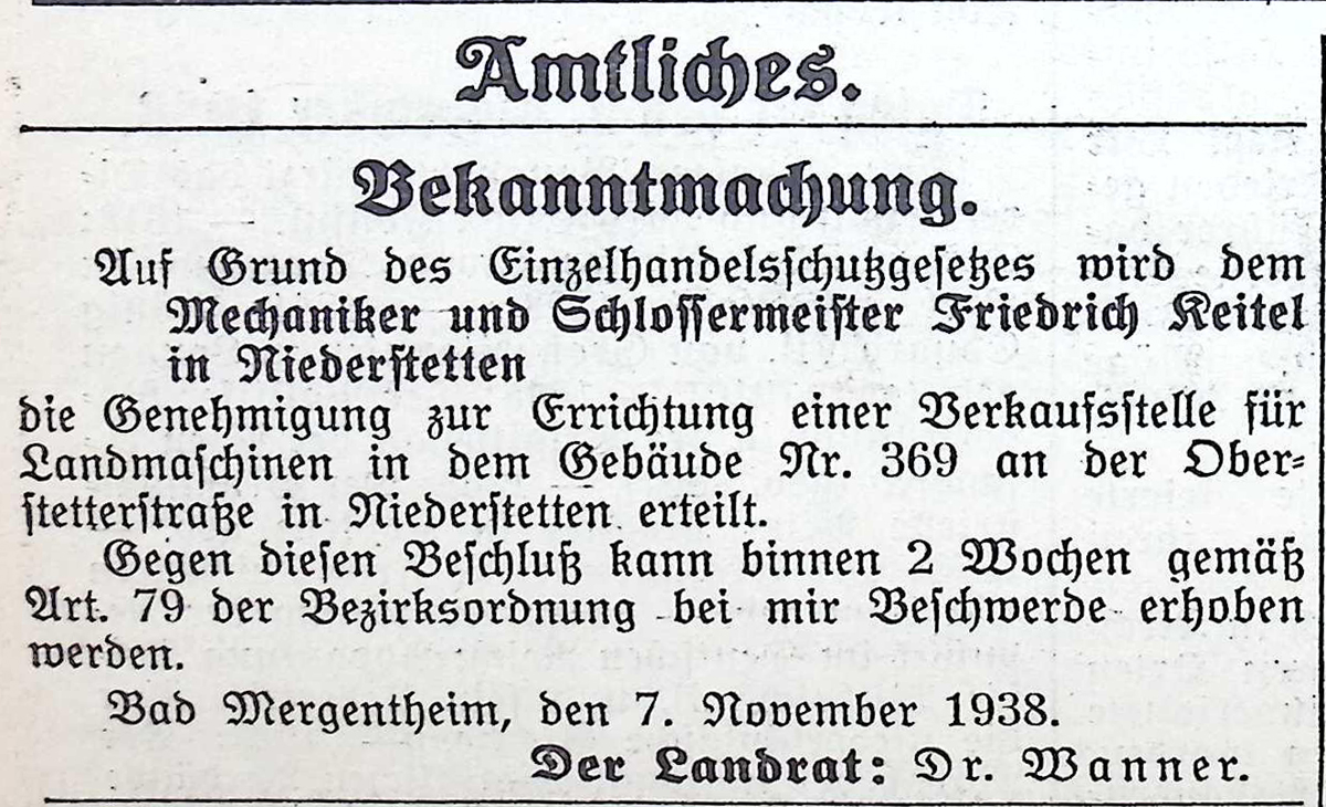 9. November 1938. Anzeige Friedrich Keitel erhält Genehmigung für Verkaufsstelle