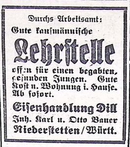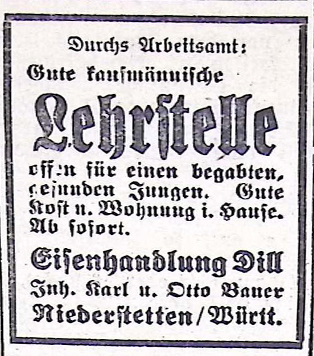 8. Januar 1941. Anzeige Eisenhandlung Dill bietet Lehrstelle