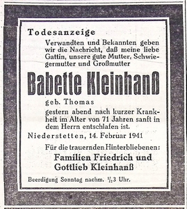 15. Februar 1941. Todesanzeige Babette Kleinhanß