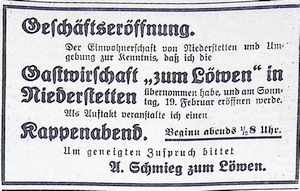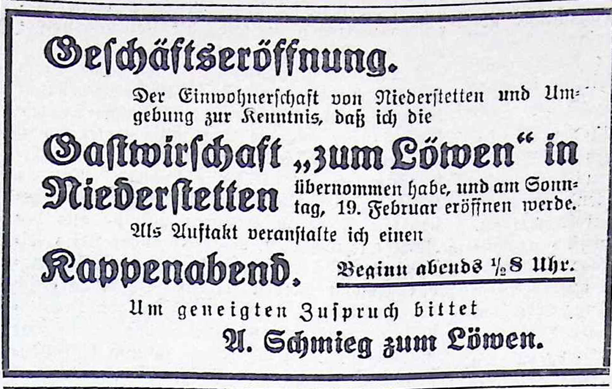 16. Februar 1939. Anzeige Geschäftseröffnung Gasthaus Löwen