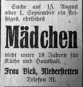 12. August 1928. Anzeige Frau Biek sucht "Mädchen"