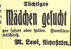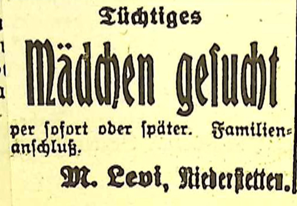13. April 1924. Anzeige M. Levi sucht "Mädchen"