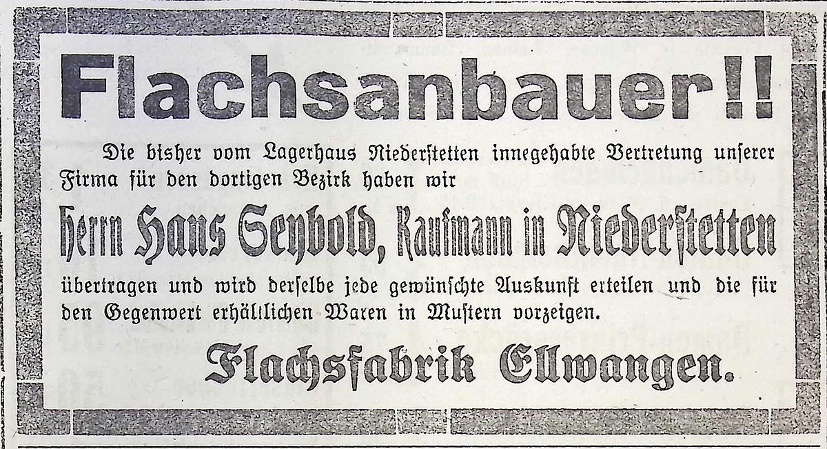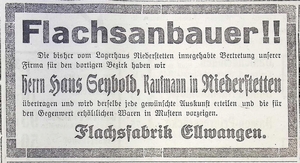 13. September 1924. Anzeige Hans Seybold vertritt Flachsfabrik Ellwangen