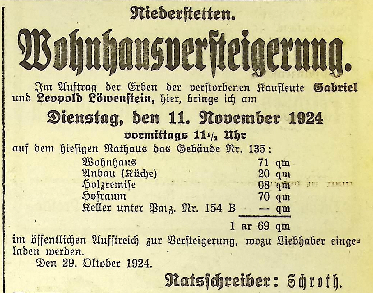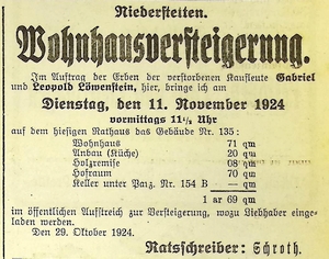 1. November 1924. Anzeige Hausversteigerung Gabriel und Leopold Löwenstein