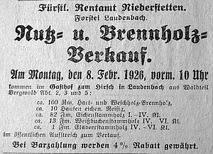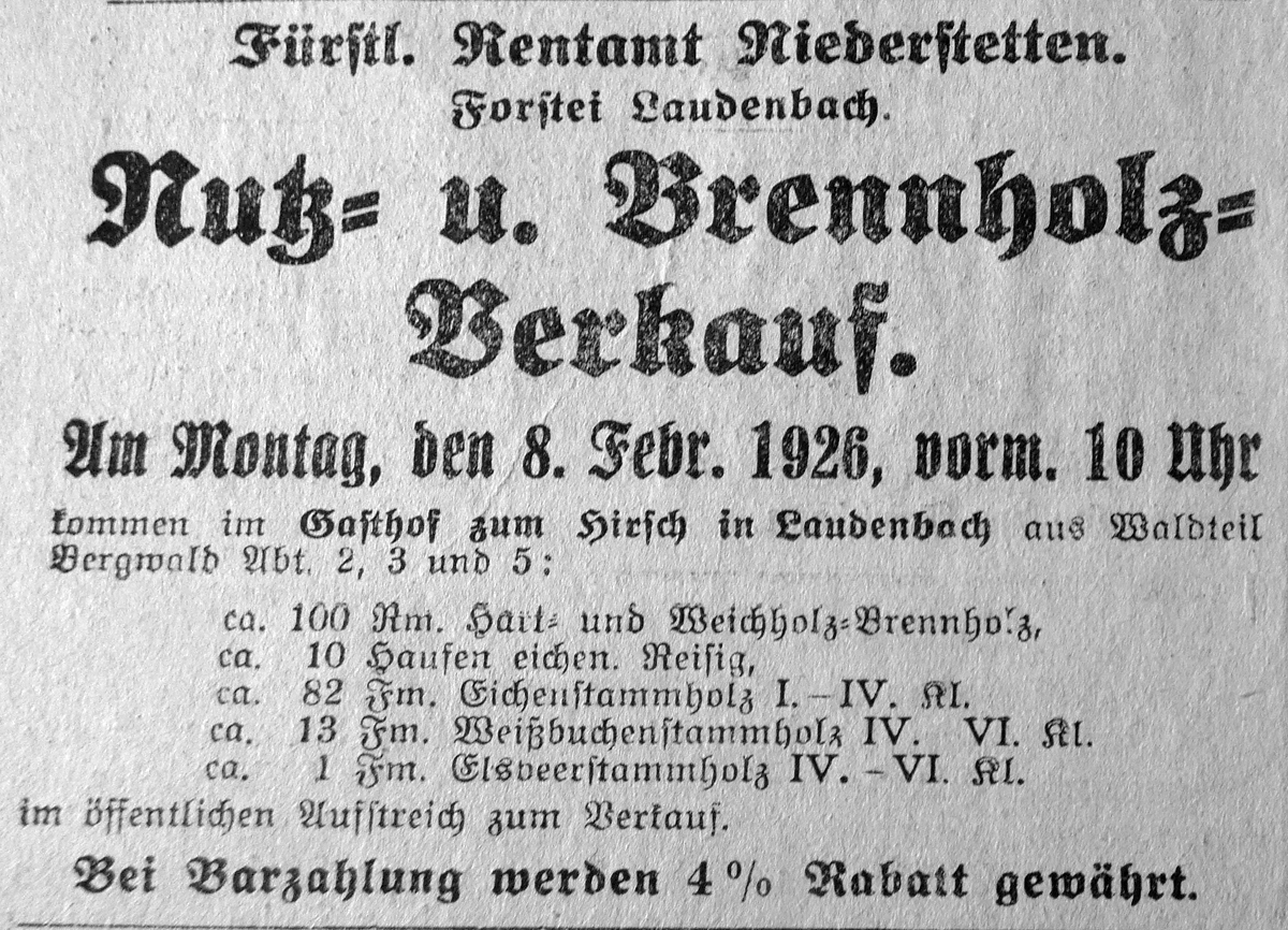 4. Februar 1926. Anzeige Fürstl. Rentamt Niederstetten. Nutz- u. Brennholz-Verkauf