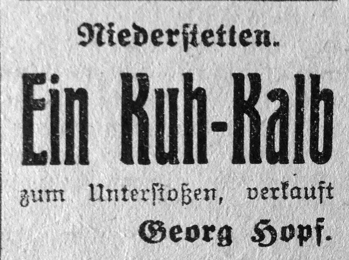 2. Mai 1928. Anzeige Georg Hopf verkauft Kuh-Kalb