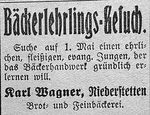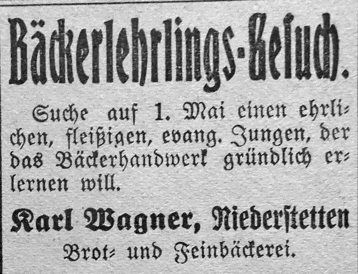 18. Februar 1937. Anzeige Karl Wagner sucht Bäckerlehrling