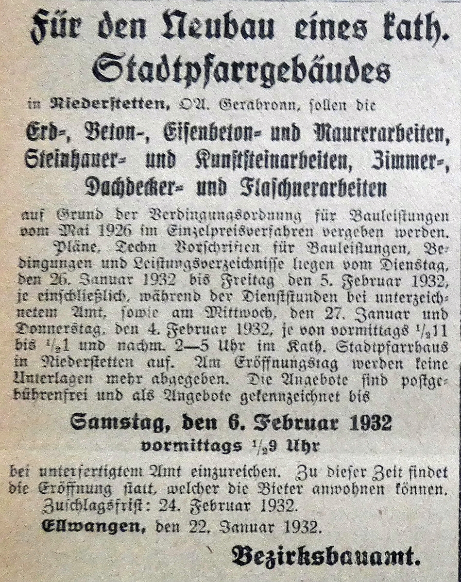 25. Januar 1932. Ausschreibung für Neubau des kath. Stadtpfarramtes