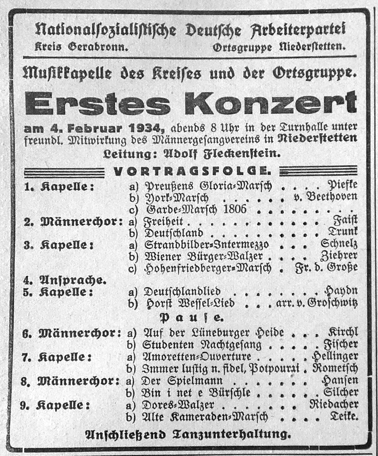 Niederstetten, 5. Febr. (Konzert der Musikkapelle des Kreises und der Ortsgruppe Niederstetten.) Die neugegründete Kreismusikkapelle veranstaltete am Sonntag in der Turnhalle unter Leitung von Chormeister Fleckenstein, Bad Mergentheim, ihr erstes Konzert. Das Konzert nahm mit militärischer Pünktlichkeit seinen Anfang mit drei flott gespielten Märschen. Die in das Programm eingeflochtenen Gesangsvorträge des Männergesangvereins Niederstetten, ebenfalls unter der bewährten Leitung seines Chormeisters Fleckenstein, weiteten das Konzert zu einem vollen Erfolge aus, was sich auch äußerlich durch den spontanen Beifall, den die Vortragenden erzielten und durch die wiederholten Hervorrufe, auswies. Ortsgruppenleiter Fr. Thomas begrüßte in einer Ansprache die seiner Einladung so überaus zahlreich gefolgten Volks- und Parteigenossen und deutete darauf hin, wie die Kreismusikkapelle entstanden sei aus der Sturmkapelle Oberstetten, zum Danke für ihre geleistete Arbeit in den Kampfjahren, auf besonderen Wunsch des stellv. Gauleiters Schmidt. Zum Gedenken des ersten Jahrestages der Machtübernahme der nationalsozialistischen Bewegung sangen die Anwesenden das Deutschland- und das Horst Wessel-Lied. Den Besuchern des Konzertes, besonders auch den vielen Gästen aus nah und fern, wird der Abend lange Zeit in Erinnerung bleiben und gerne werden sie den ferneren Einladungen zu Konzertbesuchen der Kreismusikkapelle Folge leisten. Als letzte Programmnummer folgte eine Tanzunterhaltung. Auch hier bewies die Kapelle ihr Können und lud damit zahlreiche Tanzlustige zu längerem Verweilen ein.