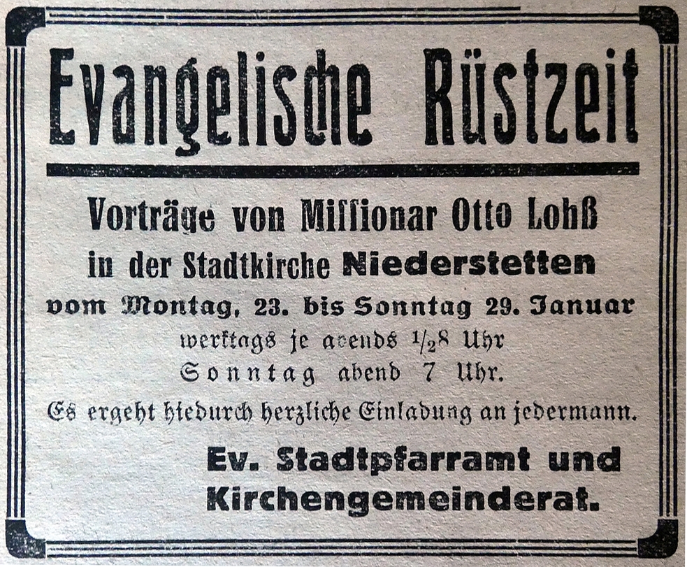 Otto Lohß, der zu diesen Vorträgen vom Kirchengemeinderat gerufen wurde, war jahrelang als Basler Missionar in China, über den Krieg im Dienst der württ. Kirche, dann war er vier Jahre Inspektor der Stadtmission Pforzheim. Seit über zehn Jahren steht er im Heimatdienst der Basler Mission als Volksmissionar und Evangelist hin und her in Süd- und Mitteldeutschland. Vielen Gemeinden in Stadt und Land hat er gedient und reiche Erfahrung sammeln können. Er ist ein Freund der heranwachsenden, um ihre Zukunft ringende Jugend. Er möchte hier, wie er das anderwärts tun durfte, der ganzen Gemeinde dienen.
