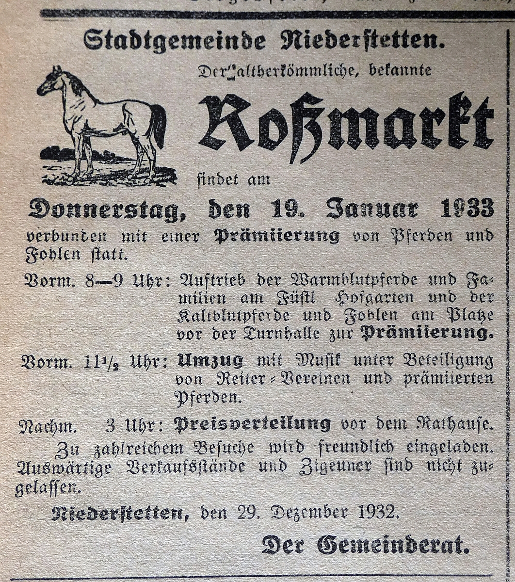 () Niederstetten, 21. Jan. Unser Roßmarkt hat auch in diesem Jahr seine alte Anziehungskraft bewiesen. Von überall her aus dem Hohenloher Land und auch über dessen Grenzen hinaus waren Landwirte und Händler gekommen. Freilich, ganz so groß wie in früheren Jahren war die Besucherzahl nicht, denn die wirtschaftliche Notzeit macht sich auch hier bemerkbar. Erfreulich war die große Anzahl von Interessenten für gutes Pferdematerial, so daß eine große Anzahl von Kaufsabschlüssen zu stande kam. Pferdehändler und Pferdezüchter hatten sehr schönes Material auf den Markt gebracht. Die Preise für Pferde sind noch hoch und an dem Mißverhältnis der Pferdepreise zu den Viehpreisen scheiterte mancher Kauf. Der Pferdemarktzug unter Vorantritt der Stadtkapelle (Schmidt) fand unter sehr großer Beteiligung statt. Den Pferdehändlern wurde von der Stadt, um die Händler im Handel nicht aufzuhalten, eine Auftriebsprämie gereicht. Die Prämierung ergab folgende Resultate:
