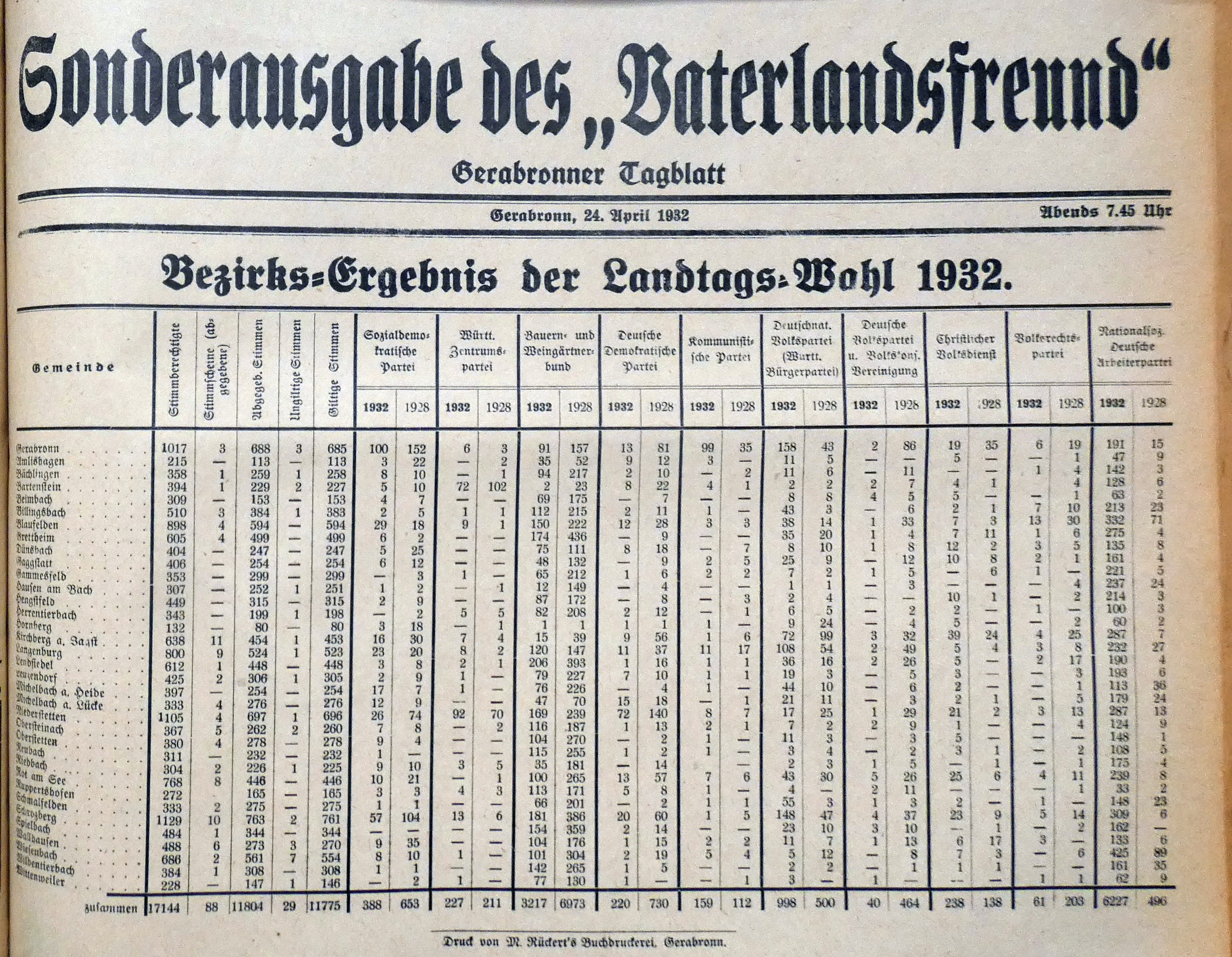 24. April. 1932. Bezirks-Ergebnis der Landtagswahl