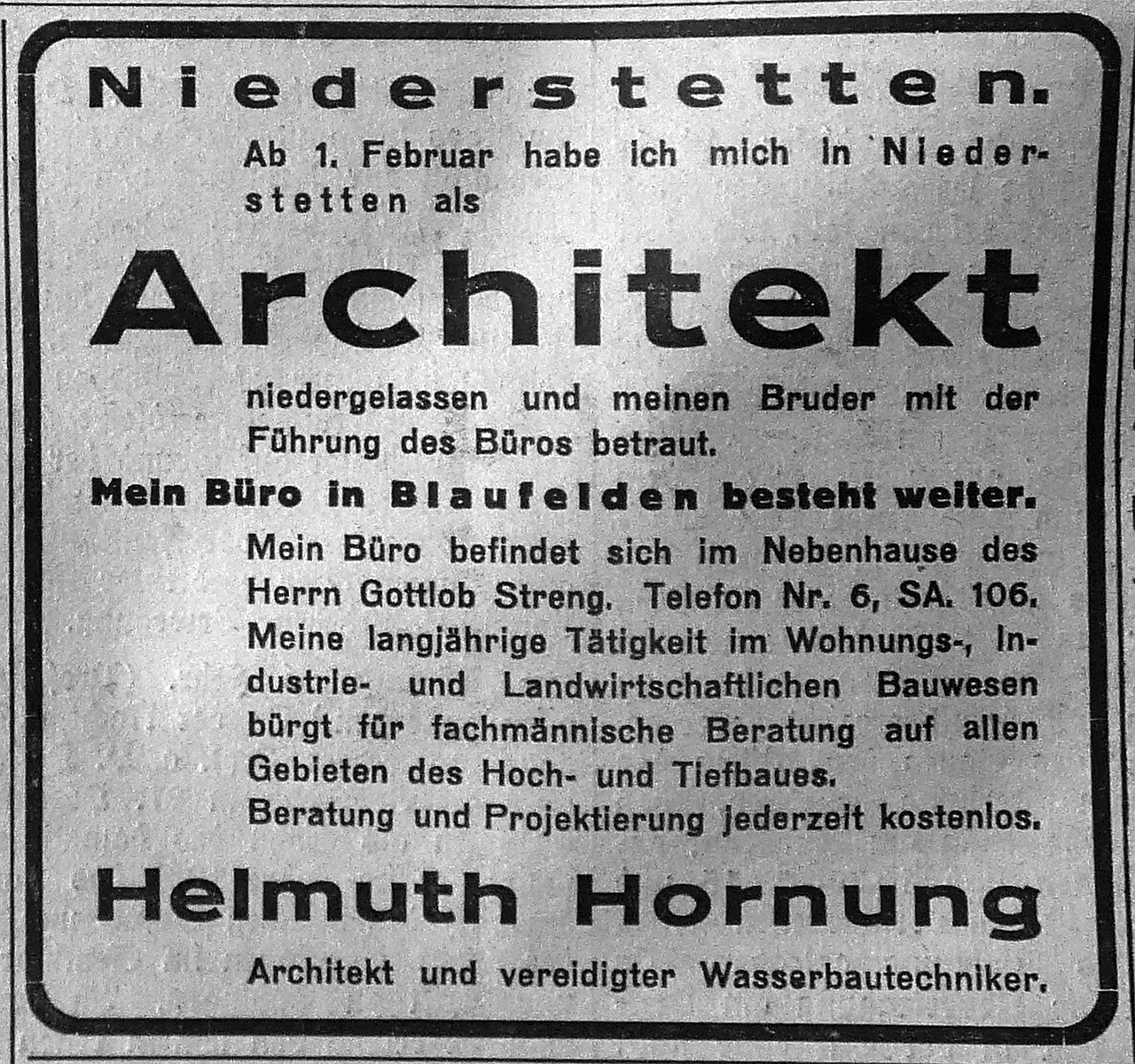 7. Februar 1934. Anzeige Architekt Helmuth Hornung eröffnet Büro