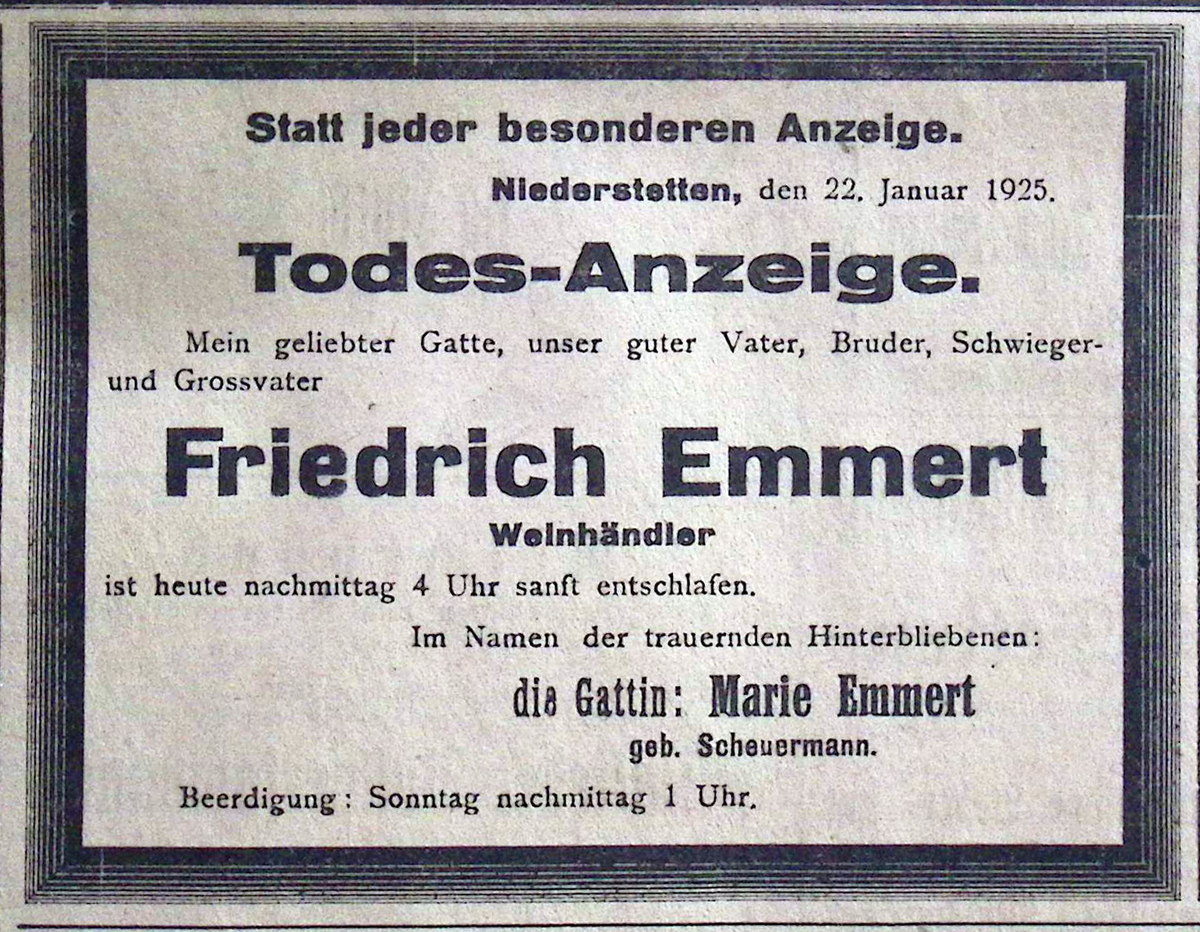 24. Januar 1925. Todesanzeige Friedrich Emmert