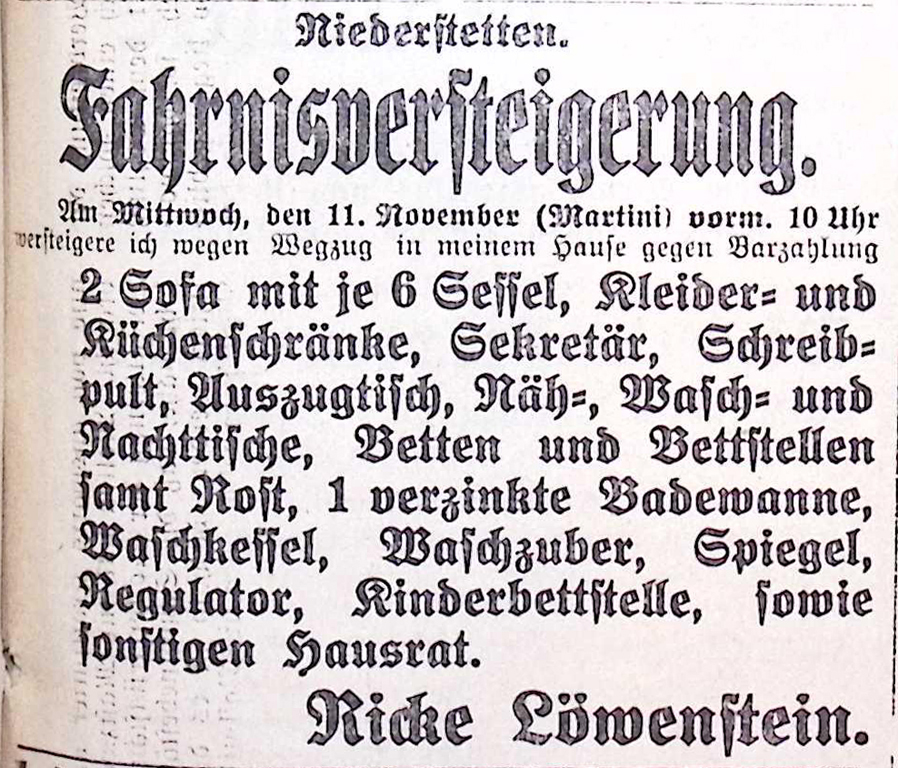 7. November 1925. Anzeige Fahrnisversteigerung Ricke Löwenstein