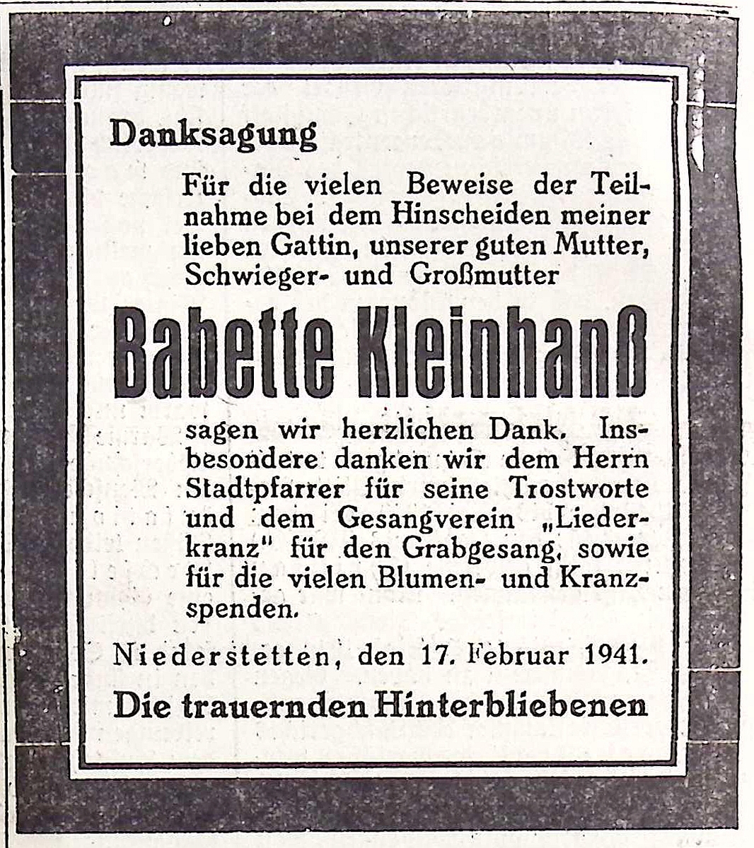 19. Februar 1941. Danksagung Babette Kleinhanß