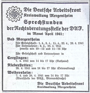 29. März 1941. Anzeige Sprechstunden der Deutschen Arbeitsfront
