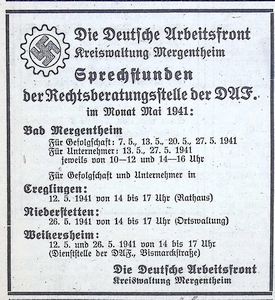 3. Mai 1941. Anzeige Sprechstunden der Deutschen Arbeitsfront
