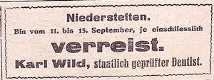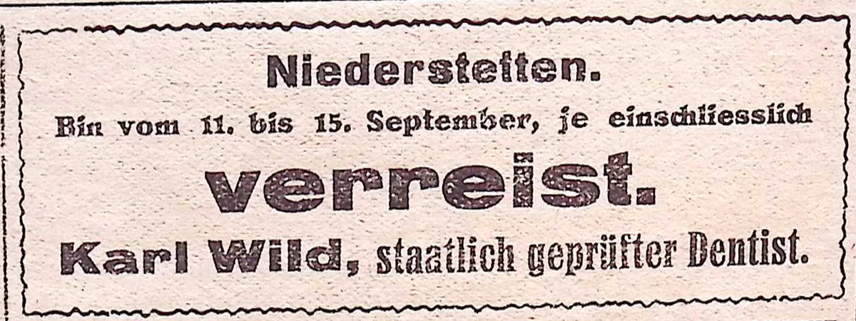 13. September 1925. Anzeige Dentist Karl Wild verreist
