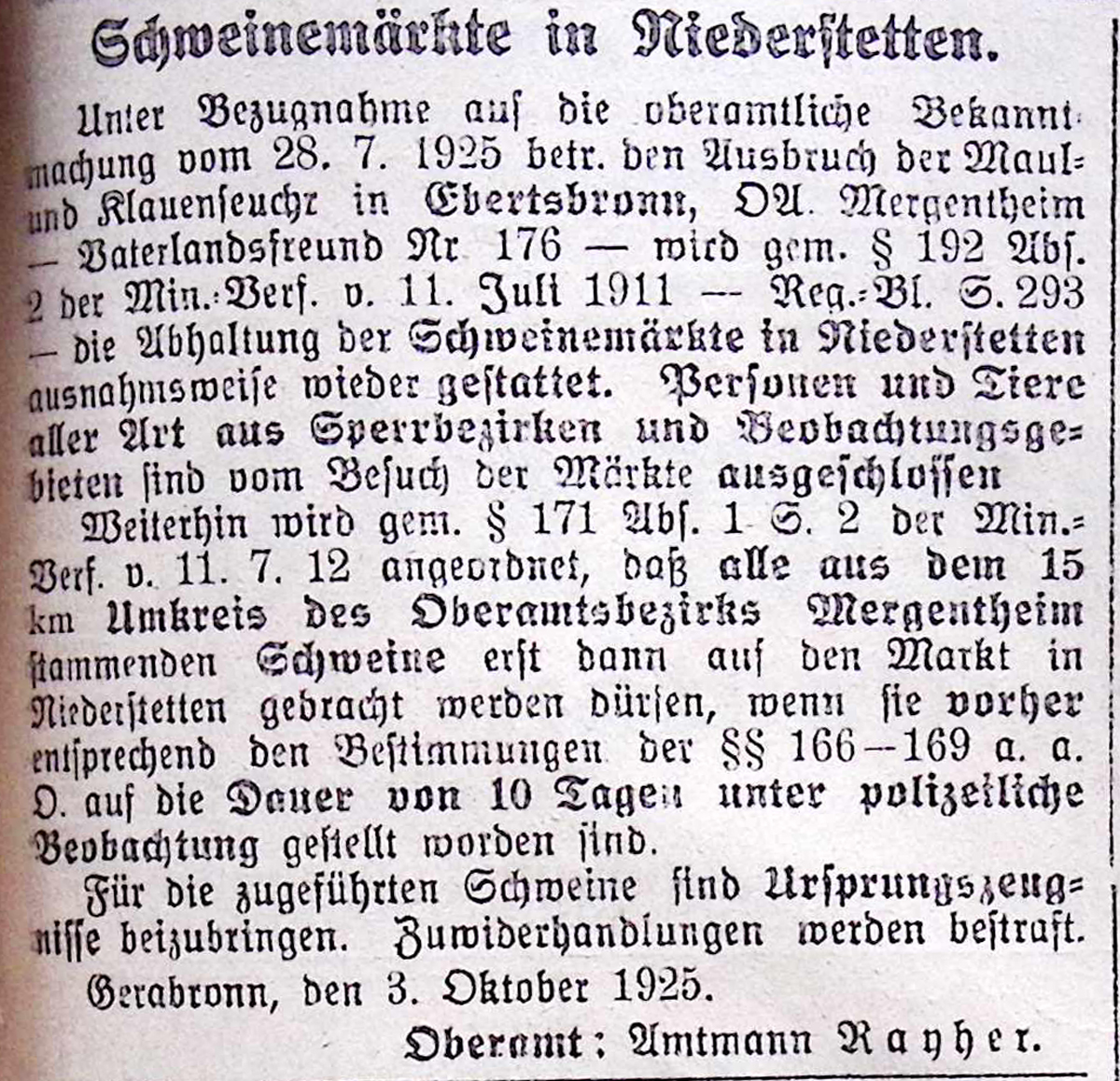 Nächster Beitrag: 10. Oktober 1925. Anzeige Schweinemarkt