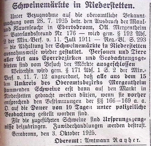 10. Oktober 1925. Amtliche Mitteilung Schweinemärkte