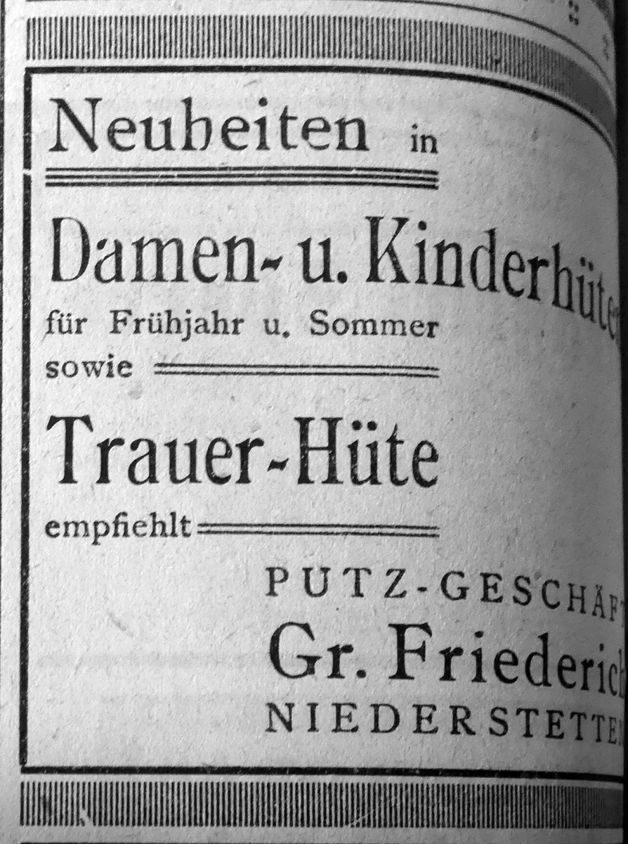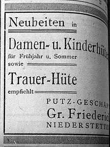 27. März 1929. Anzeige Putzmacherin Gr. Friederich