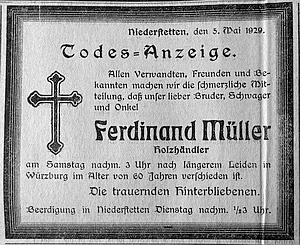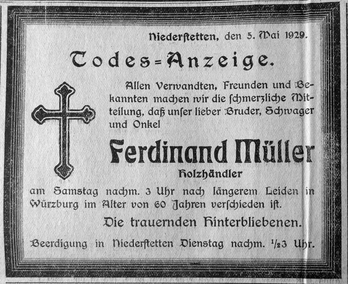 7. Mai 1929. Todesanzeige Ferdinand Müller