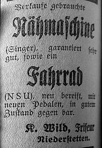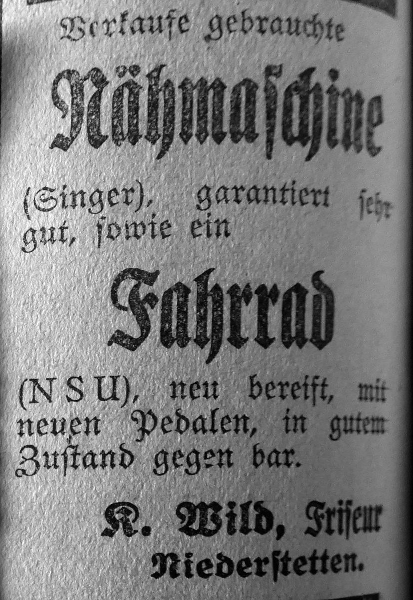 3. Juni 1929. Anzeige Friseur Wild verkauft Nähmaschine und Fahrrad