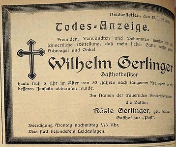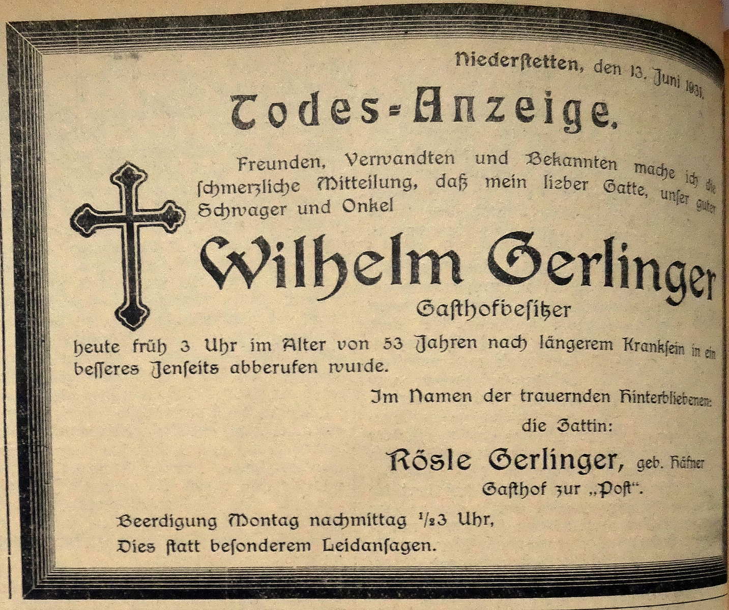 13. Juni 1931. Todesanzeige Postwirt Wilhelm Gerlinger