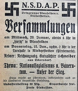 20. und 21. Januar 1932. NSDAP-Versammlung: Nationalsozialismus u. Bauerntum