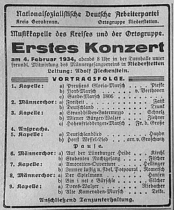 2. Februar 1934. Anzeige Konzert, organisiert von der NSDAP, Kreis und Ortsgruppe
