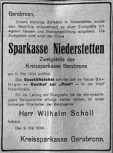 14. Mai 1934. Anzeige Sparkassenfiliale eröffnet