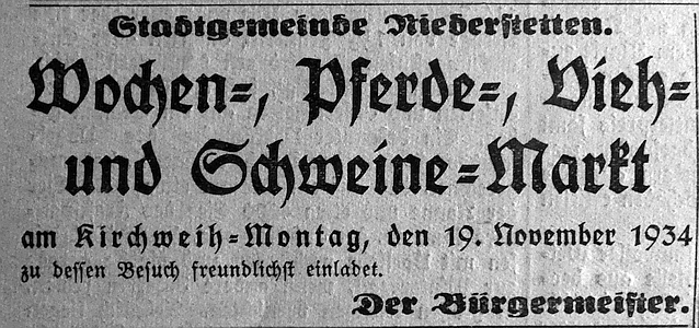 14. November 1934. Anzeige Wochen-, Pferde-, Vieh- und Schweinemarkt