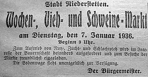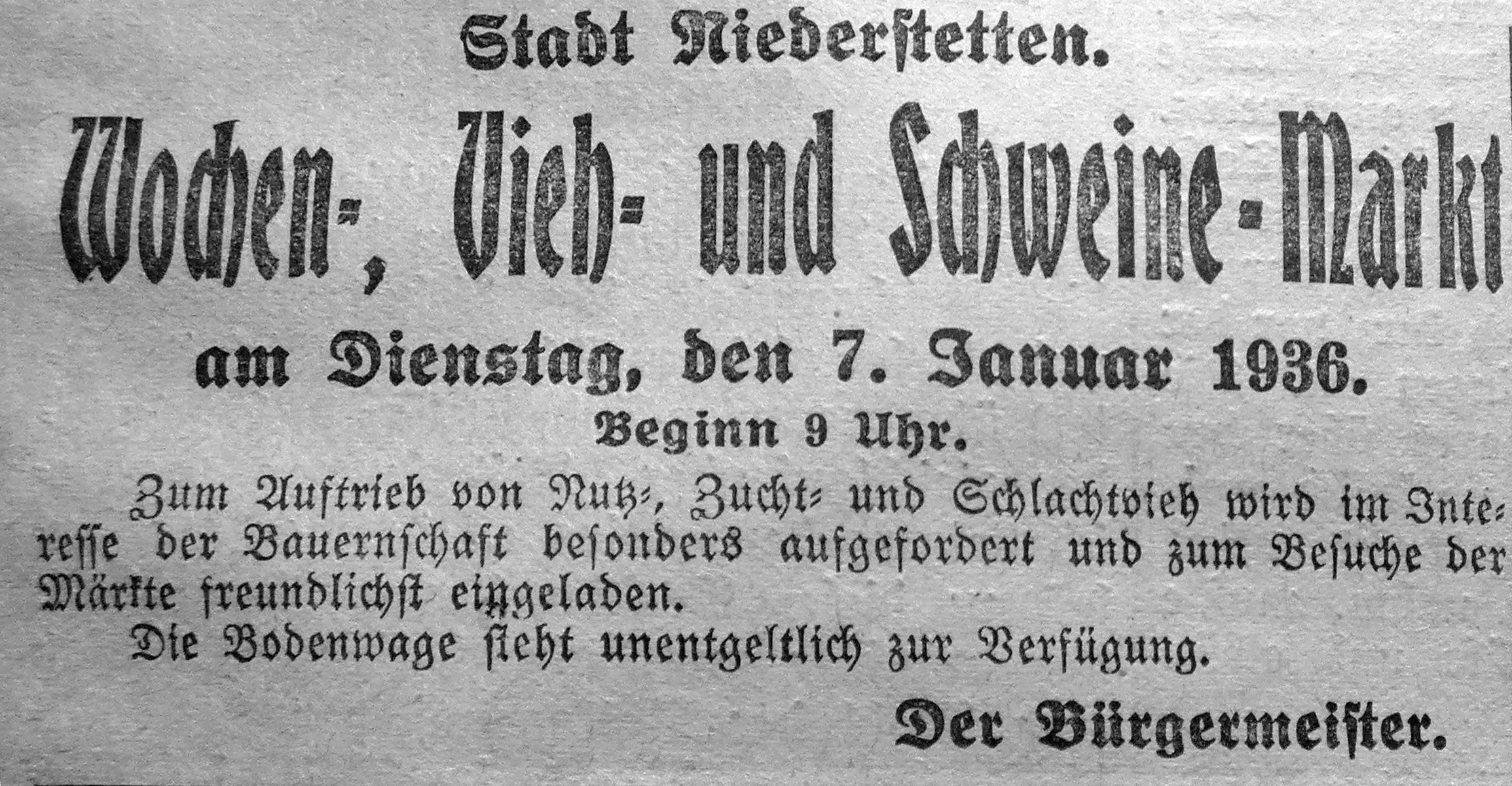 3. Januar 1936. Anzeige Wochen-, Vieh- und Schweine-Markt