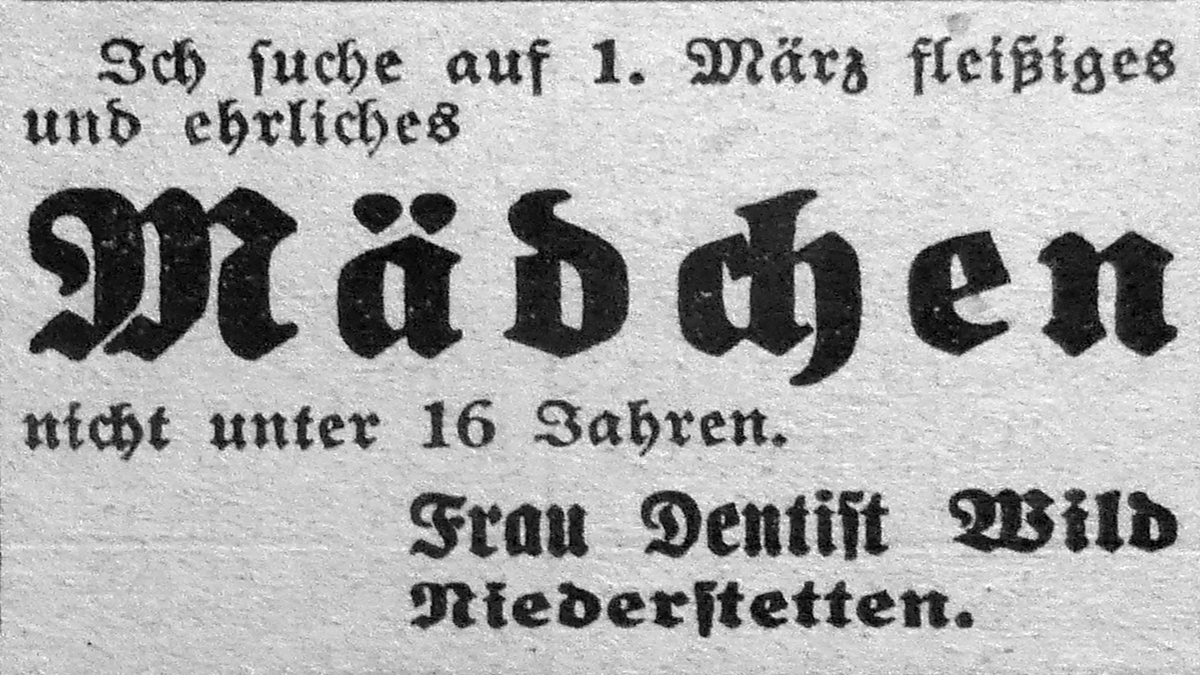 Nächster Beitrag: 2. Februar 1937. Anzeige Dentist Wild sucht "Mädchen"