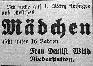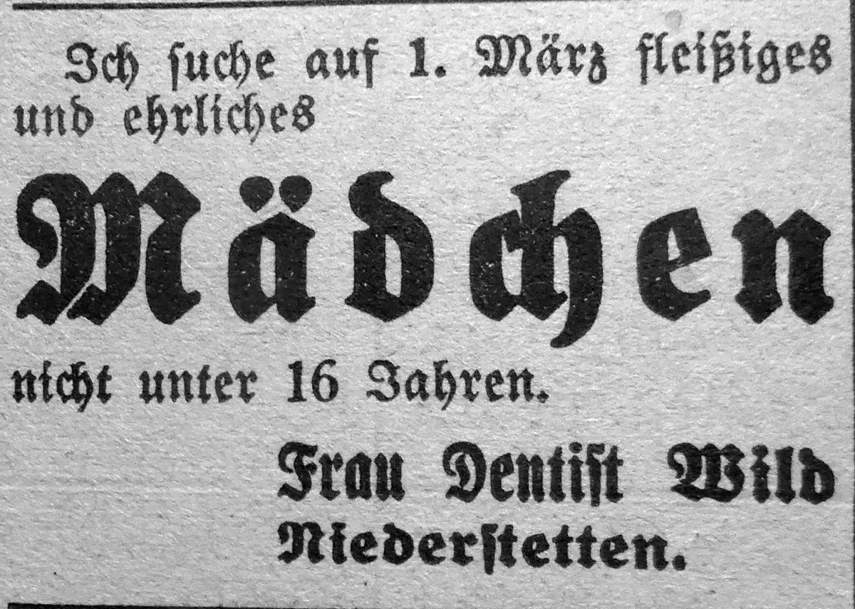 2. Februar 1937. Anzeige Dentist Wild sucht "Mädchen"