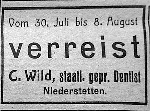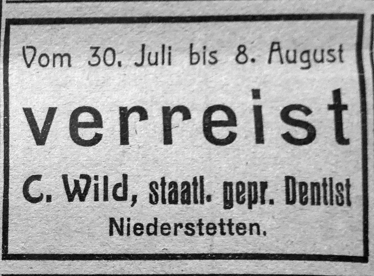 30. Juli 1937. Anzeige Dentist C. Wild verreist