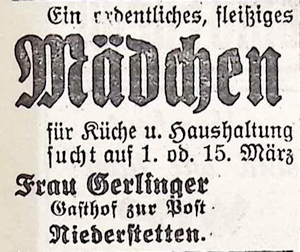 26. Februar 1938. Frau Gerlinger (Gasthof zur Post) sucht "Mädchen"
