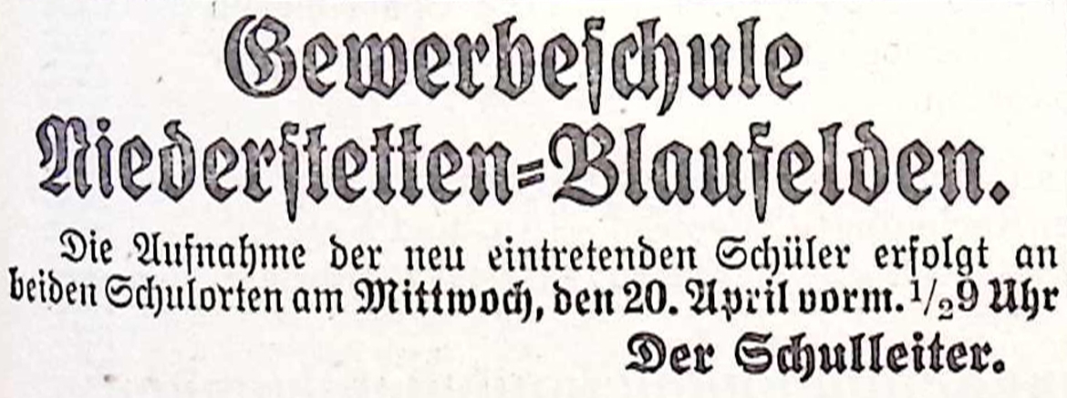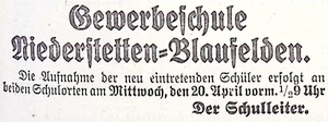 16. April 1938. Anzeige Gewerbeschule Niederstetten-Blaufelden