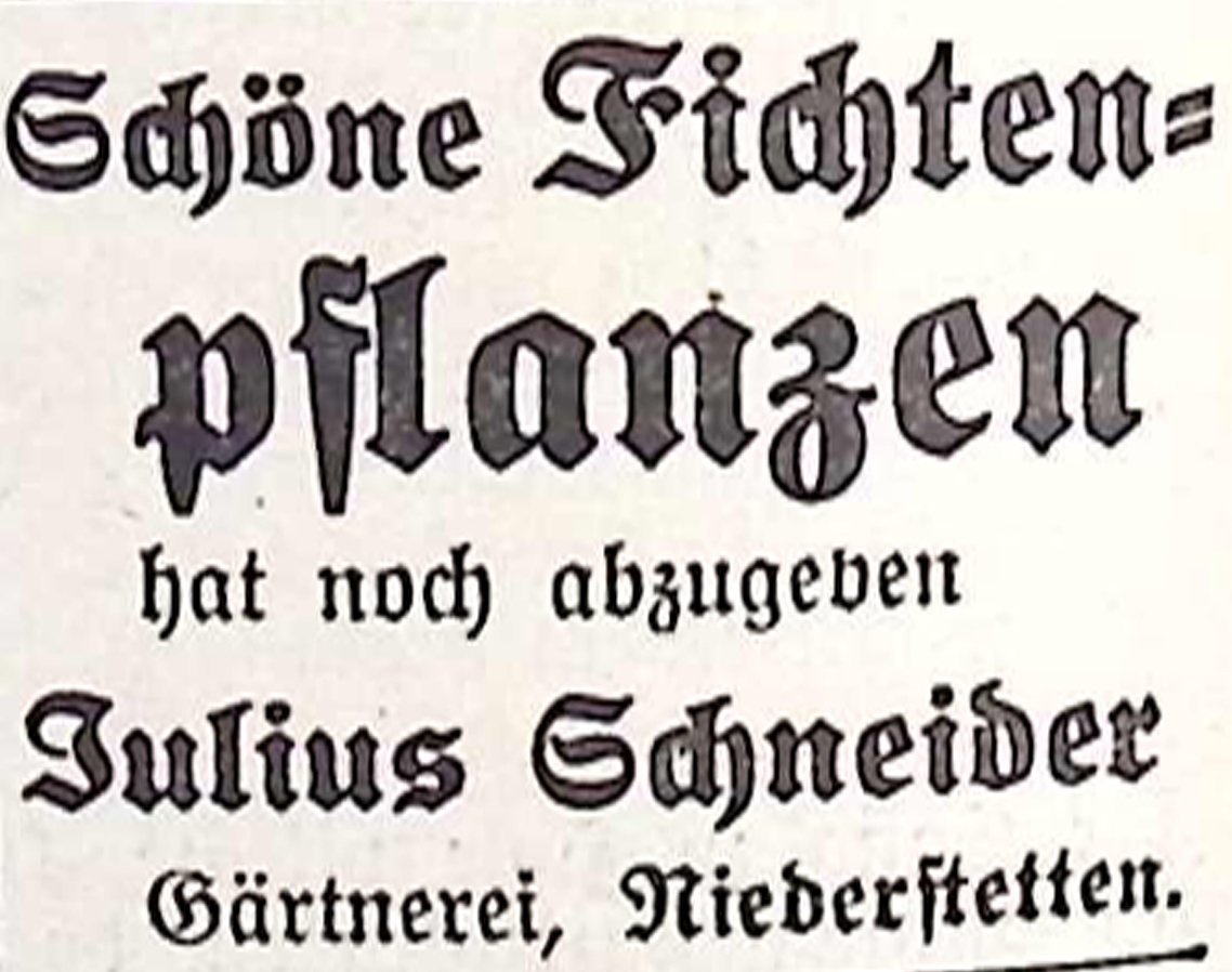 27. April 1938. Anzeige Julius Schneider verkauft Fichtenpflanzen