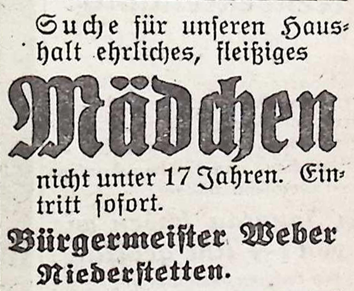 28. Mai 1938. Anzeige Bürgermeister Weber sucht "Mädchen"