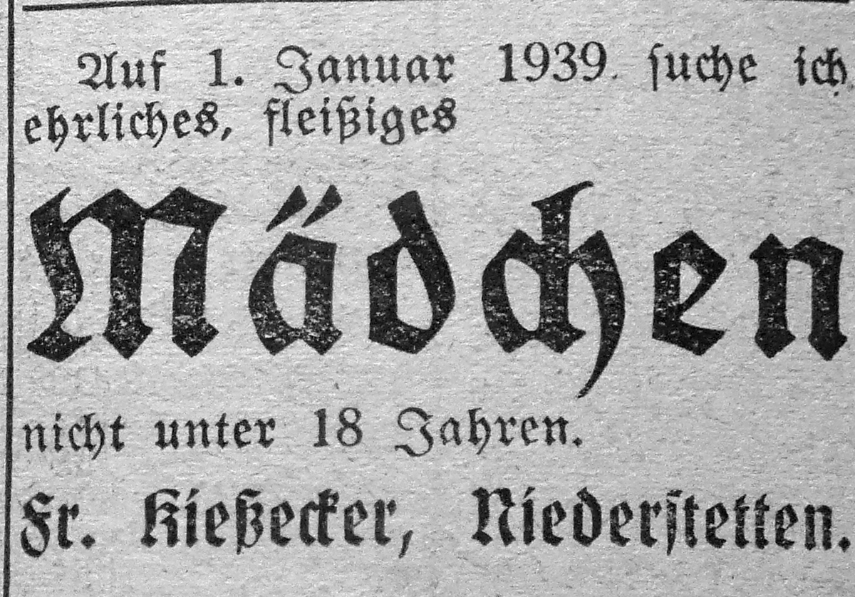 26. November 1938. Fr. Kießecker sucht "Mädchen"