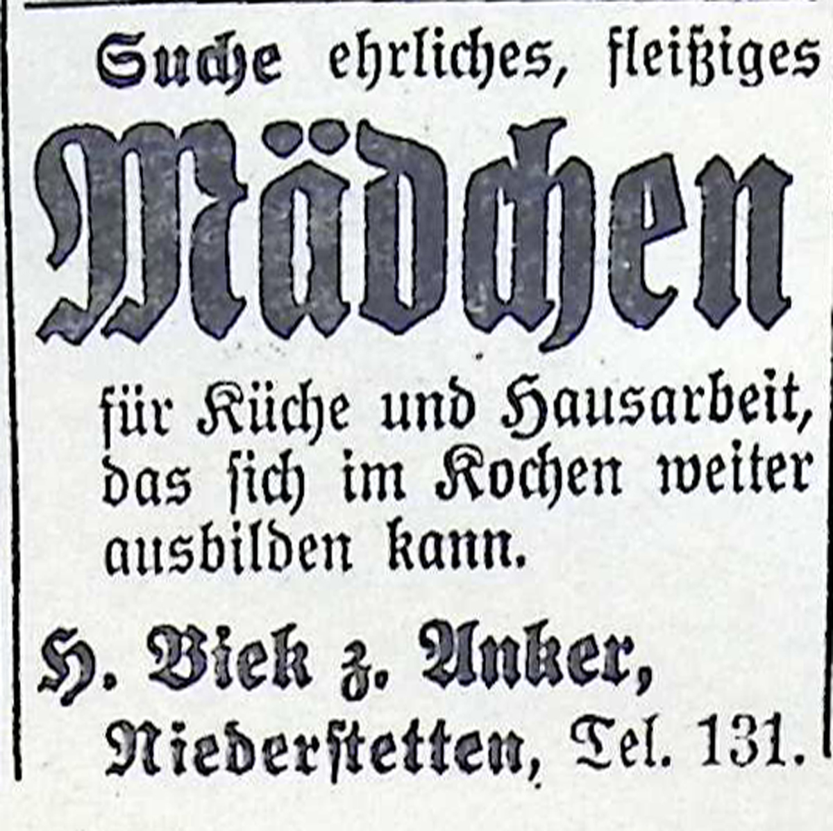 2. März 1939. Anzeige Biek zum Anker sucht "Mädchen"