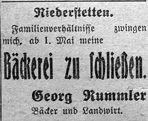 26. April 1939. Anzeige Bäckerei Georg Rummler schließt