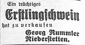 3. März 1943. Anzeige Georg Rummler verkauft Erstlingsschwein