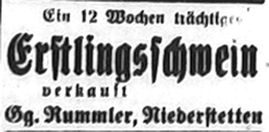 15. Februar 1944. Anzeige Georg Rummler verkauft Erstlingsschwein