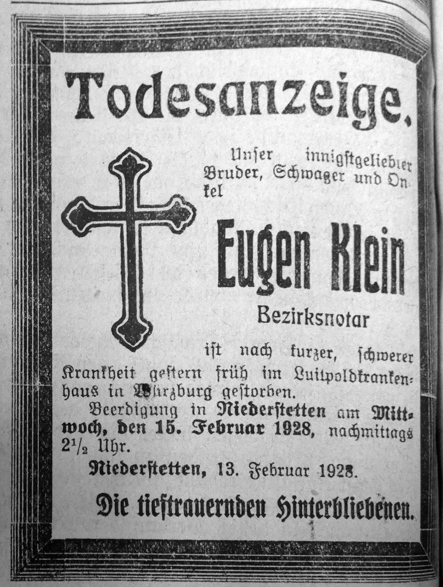 14. Februar 1928. Todesanzeige Bezirksnotar Eugen Klein